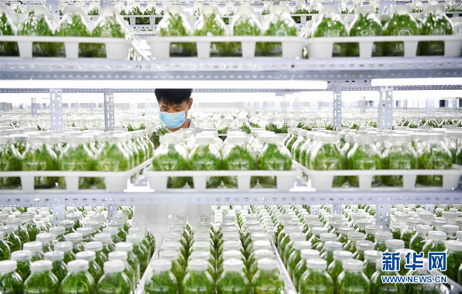 4月21日,在位于施茶村的海南勝嶸生物科技有限公司石斛育種培養(yǎng)室內(nèi),工作人員查看石斛種苗的生長(zhǎng)情況。新華社記者郭程攝