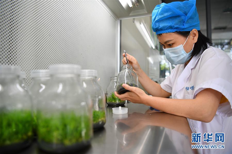4月21日,在位于施茶村的海南勝嶸生物科技有限公司石斛育種培養(yǎng)室內(nèi),工作人員在進(jìn)行石斛育種。新華社記者郭程攝