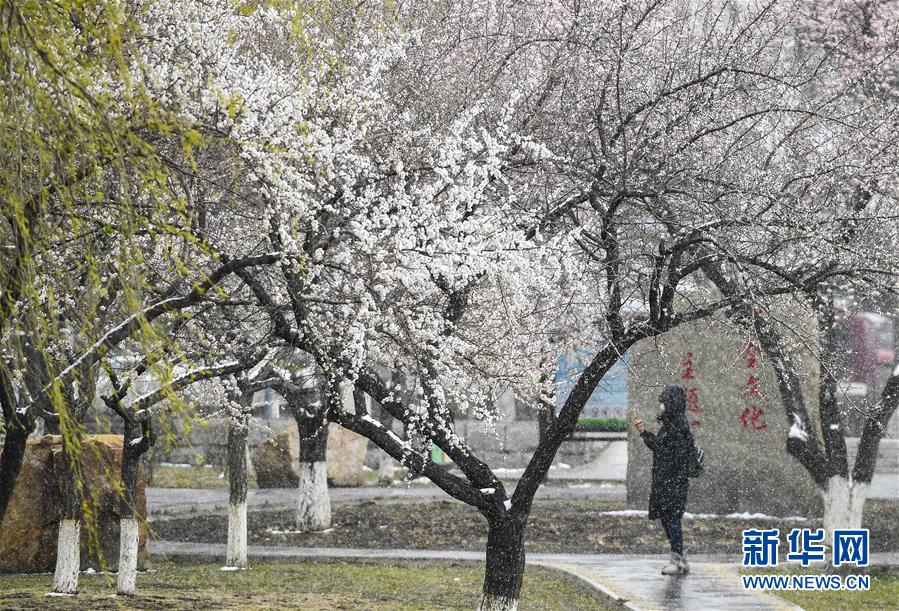 4月21日,市民在長春市杏花村公園觀賞雪景。當日,吉林省多地迎來降雪天氣。新華社記者許暢攝