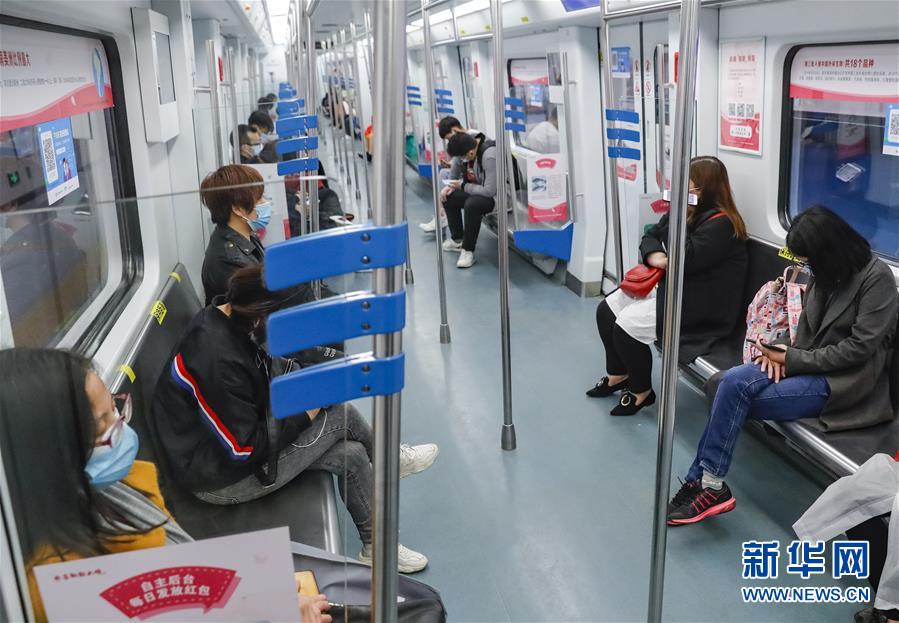 4月22日,在武漢軌道交通一號線上,乘客間隔一定距離坐在車廂里。為建立與經(jīng)濟社會發(fā)展和疫情防控需要相適應的運輸服務保障機制,保障市民出行需求,從4月22日起,武漢城市公共交通有序恢復全線網(wǎng)運營。新華社記者沈伯韓攝