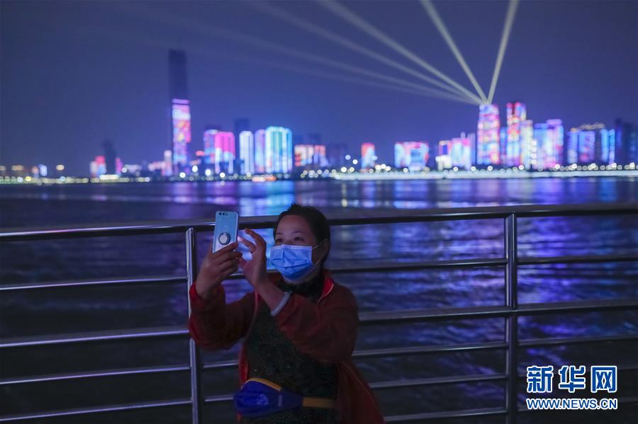 4月22日,市民乘坐武漢長江客運輪渡出行時,在船上拍攝夜景。為建立與經(jīng)濟社會發(fā)展和疫情防控需要相適應的運輸服務保障機制,保障市民出行需求,從4月22日起,武漢城市公共交通有序恢復全線網(wǎng)運營。新華社記者沈伯韓攝