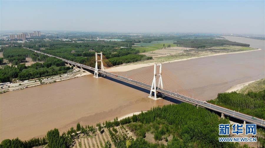 4月24日在山東濟南拍攝的黃河景色(無人機照片)。春暖花開的時節(jié),濟南黃河兩岸春風送綠,大河、綠植與城市構(gòu)成了一幅春的畫卷。新華社記者王凱攝
