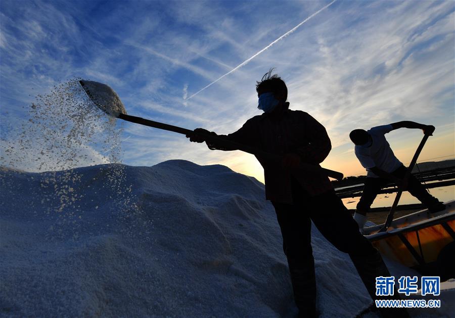4月27日,莆田鹽場的工人在勞作。莆田鹽場位于福建省莆田市秀嶼區(qū)東嶠鎮(zhèn),辛勤勞作的鹽工、縱橫交錯的曬鹽池,共同構(gòu)成如畫的風(fēng)景。新華社記者魏培全攝