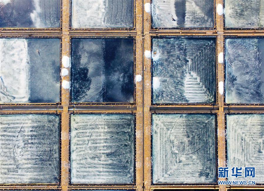 4月27日,莆田鹽場的工人在曬鹽池里忙碌(無人機照片)。莆田鹽場位于福建省莆田市秀嶼區(qū)東嶠鎮(zhèn),辛勤勞作的鹽工、縱橫交錯的曬鹽池,共同構(gòu)成如畫的風(fēng)景。新華社記者魏培全攝
