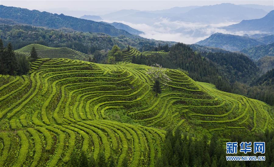 俯瞰鹿鳴茶海一角(4月28日無人機照片)。四川省珙縣的鹿鳴茶海,常年云霧繚繞,茶壟依山分布,美不勝收。新華社記者江宏景攝