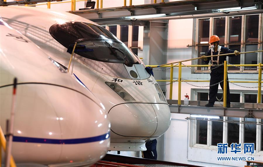 4月29日夜,工作人員在合肥南動車運用所內對動車組進行清潔。每當夜深人靜的時候,合肥南動車運用所卻燈火通明,“動車安全守護者”們堅守崗位,對動車組進行全面細致檢修。新華社記者 劉軍喜 攝
