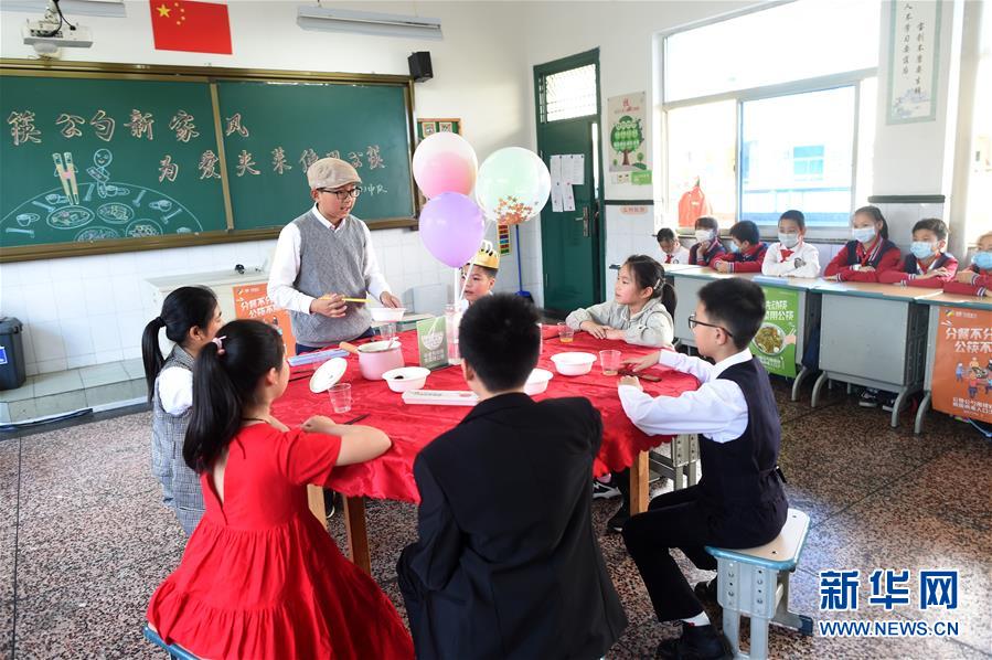 4月30日,諸暨市暨陽小學(xué)五年級4班學(xué)生在表演家庭用餐時使用公筷公勺的情景劇。當(dāng)日,浙江省諸暨市暨陽小學(xué)五年級4班開展“公筷公勺新家風(fēng)”主題班會活動,通過海報設(shè)計、情景劇表演等強(qiáng)化孩子們使用公筷公勺的意識,倡導(dǎo)文明用餐。新華社記者 韓傳號 攝