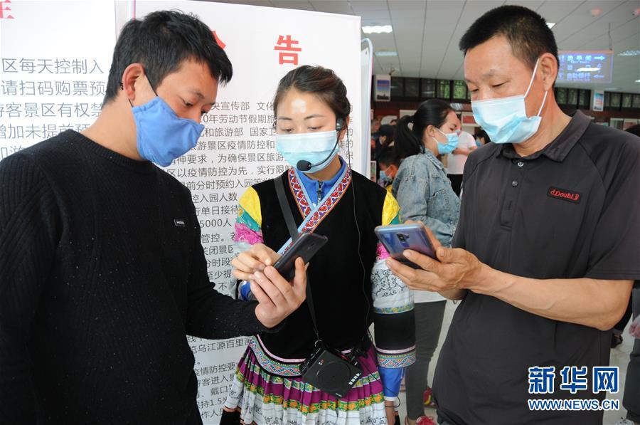 4月30日,織金洞景區(qū)工作人員(中)在給游客講解線上購票方法?!拔逡弧毙¢L(zhǎng)假將至,位于貴州省織金縣的世界地質(zhì)公園織金洞景區(qū)迎來各地游客。據(jù)了解,該景區(qū)實(shí)行分時(shí)段預(yù)約和人數(shù)限流措施,確保游客安全有序游覽。新華社記者 李黔渝 攝