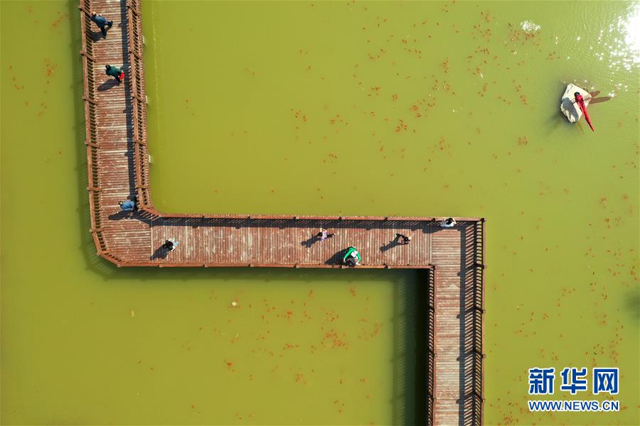 5月1日,游客在河南省鶴壁市淇濱區(qū)鉅橋鎮(zhèn)崗坡村棧橋上游玩(無人機照片)。河南省鶴壁市淇濱區(qū)鉅橋鎮(zhèn)崗坡村是一座有著千年歷史的古村落。近年來,淇濱區(qū)深入踐行鄉(xiāng)村振興戰(zhàn)略,打造以崗坡村為中心的龍崗鄉(xiāng)村振興示范帶,采取“村集體土地入股、資金入股、年底分紅”的運作模式,實現了“資源變資產、資金變股金、村民變股民”的“三變”。農戶通過到龍崗鄉(xiāng)村振興示范園打工等方式,實現就近就業(yè),每人每月至少有2500元至3000元的保底工資。 新華社記者馮大鵬攝