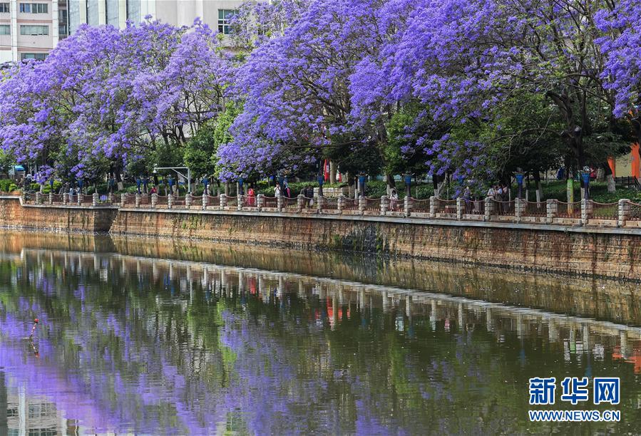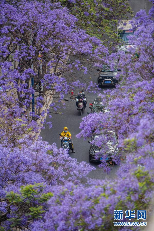這是5月2日在昆明市桃源街拍攝的藍(lán)花楹。近日,云南省昆明市部分街區(qū)的藍(lán)花楹競(jìng)相開放,為春城增添靚麗風(fēng)景。新華社記者藺以光攝