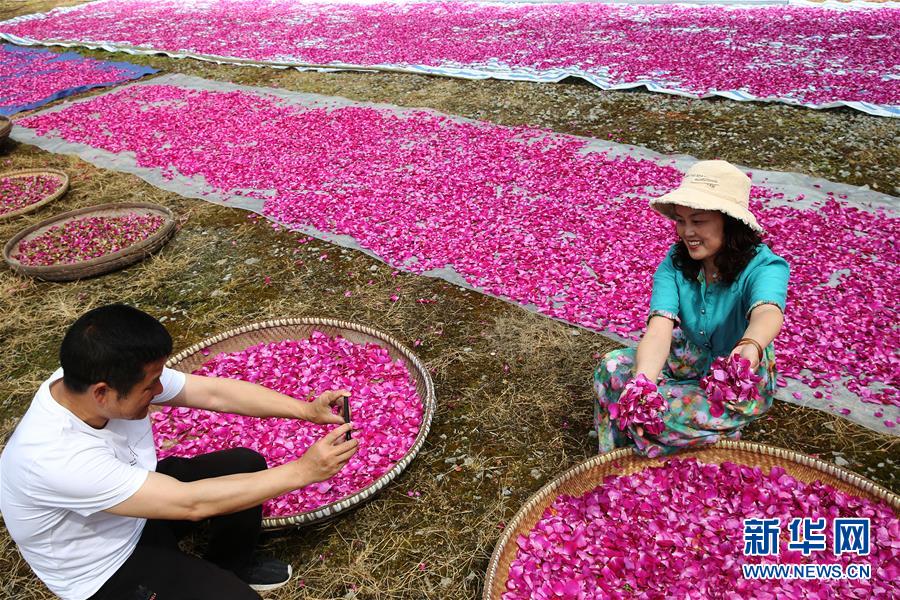 5月1日,游客在重慶市黔江區(qū)沙壩鎮(zhèn)天香玫瑰莊園體驗晾曬玫瑰花瓣。“五一”假日期間,人們以多種方式放松心情、享受假日。新華社發(fā)(楊敏攝)