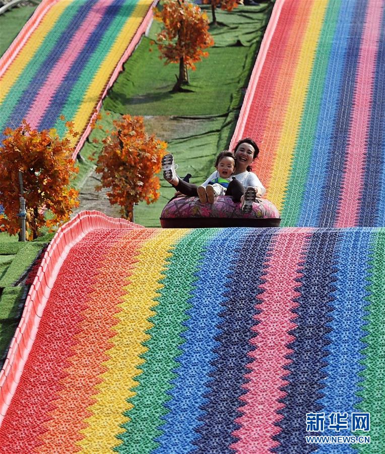 5月2日,在四川省南充市蓬安縣正源鎮(zhèn)紅豆村,游客正在七彩滑道游玩?!拔逡弧奔偃掌陂g,人們以多種方式放松心情、享受假日。新華社發(fā)(劉永紅攝)