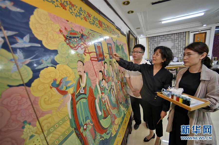 5月4日拍攝的采用金漆鑲嵌彩繪工藝繪制完成的承恩寺壁畫屏風《帝后放飛圖》。新華社記者 李欣 攝
