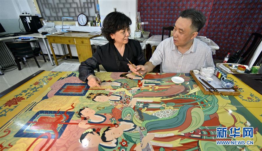 5月4日,屏風設(shè)計人、國家級非物質(zhì)文化遺產(chǎn)“金漆鑲嵌髹飾技藝”代表性傳承人柏群(右)和領(lǐng)銜主創(chuàng)的工藝美術(shù)大師胡昕進行屏風畫面的最后檢視。新華社記者 李欣 攝