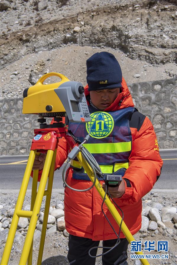 國(guó)測(cè)一大隊(duì)隊(duì)員楊明在西藏定日縣曲當(dāng)鄉(xiāng)境內(nèi)進(jìn)行水準(zhǔn)測(cè)量(5月4日攝)。水準(zhǔn)測(cè)量是一種利用提供水平視線的儀器(如水準(zhǔn)儀、水準(zhǔn)標(biāo)尺),測(cè)定地面不同點(diǎn)之間的高差,并以此推算高度的一種方法,是經(jīng)典大地測(cè)量的重要技術(shù)之一。在目前正在進(jìn)行的2020珠峰高程測(cè)量中,部分國(guó)測(cè)一大隊(duì)隊(duì)員承擔(dān)了水準(zhǔn)測(cè)量的任務(wù)。新華社記者普布扎西攝
