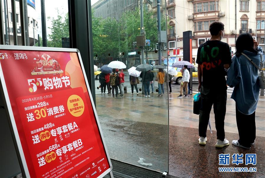 上?;春B芬患疑虉龅摹拔逦遒徫锕?jié)”標(biāo)識(5月5日攝)。5月4日晚,上海首次啟動大規(guī)模商業(yè)促銷活動“五五購物節(jié)”,多家在線新經(jīng)濟(jì)企業(yè)參與,通過線上流量優(yōu)勢反哺線下賣場,實(shí)現(xiàn)電商與實(shí)體零售融合互動,激活消費(fèi)潛力、驅(qū)動消費(fèi)復(fù)蘇。據(jù)“上海發(fā)布”的消息,截至5日14時12分,“五五購物節(jié)”上海地區(qū)消費(fèi)支付總額已超100億元。新華社記者劉穎攝