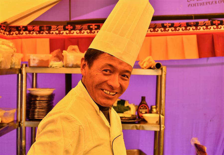 高山廚師赤列在珠峰大本營(yíng)(5月8日攝)。5月8日是世界微笑日。在海拔5200米的珠峰大本營(yíng),參與2020珠峰高程測(cè)量的各方人員,微笑期待本次測(cè)量活動(dòng)的圓滿(mǎn)成功。