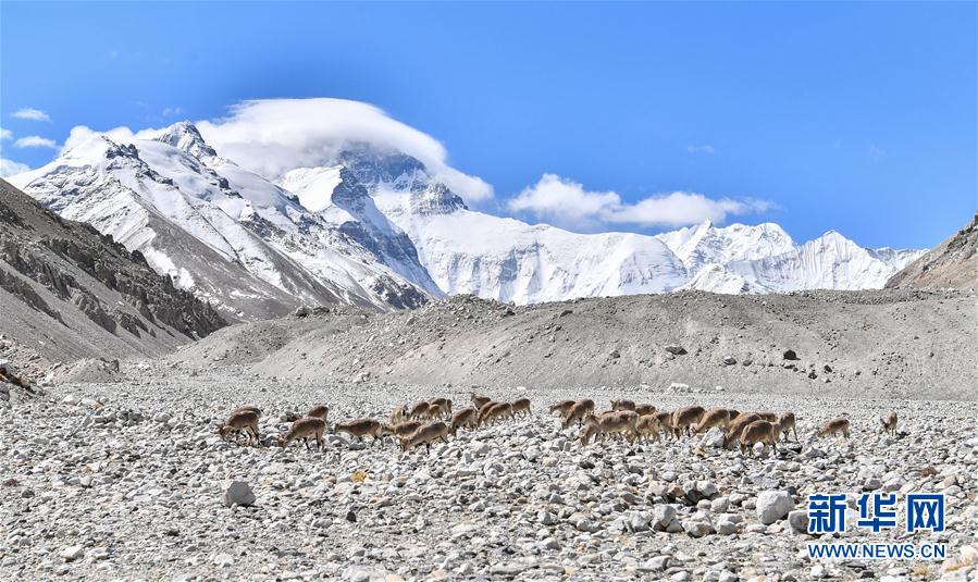 一群巖羊在珠峰大本營附近覓食(5月8日攝)。當(dāng)日,一群巖羊在珠峰大本營周圍覓食,黃嘴山鴉飛到巖羊身上停留,構(gòu)成一幅幅生動有趣的雪域圖畫。新華社記者晉美多吉攝
