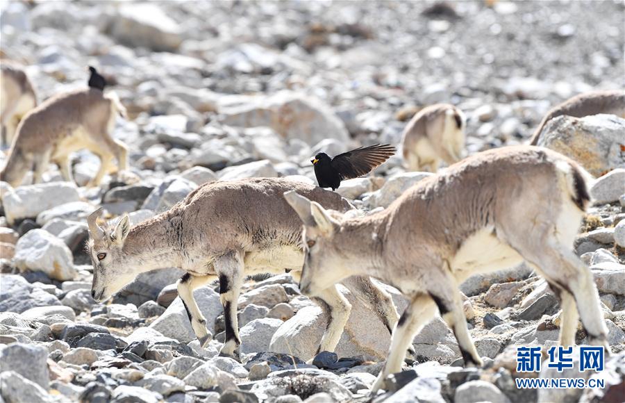 黃嘴山鴉停留在巖羊身上(5月8日攝)。當日,一群巖羊在珠峰大本營周圍覓食,黃嘴山鴉飛到巖羊身上停留,構成一幅幅生動有趣的雪域圖畫。新華社記者晉美多吉攝