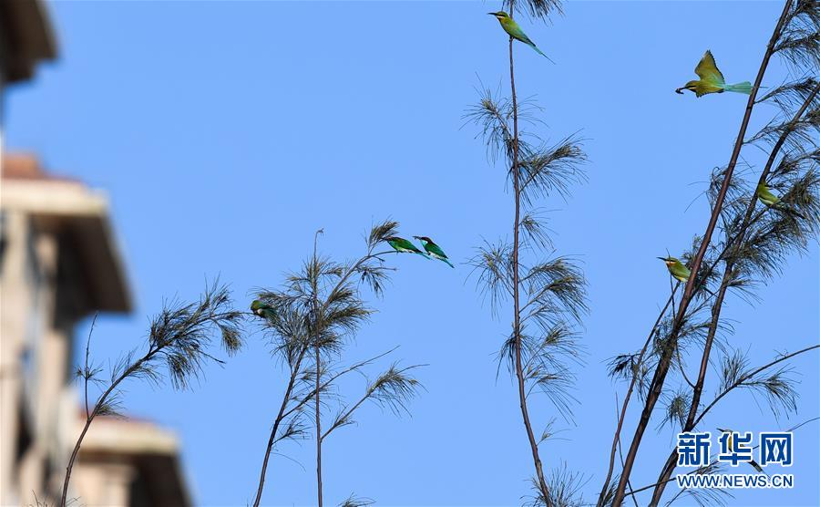 近日,百余只栗喉蜂虎和少量藍喉蜂虎來到海南省??谑形骱0抖鄠€地點棲息繁衍,為椰城增添一抹亮色。據(jù)了解,蜂虎每年春夏都會回到固定地點繁殖,由于習性特殊,蜂虎需要在新形成的沙質(zhì)土坡上做窩。為此,??谑邢嚓P(guān)部門每年在蜂虎到來之前,會在蜂虎棲息地整坡清樹,為蜂虎營造良好的棲息環(huán)境。