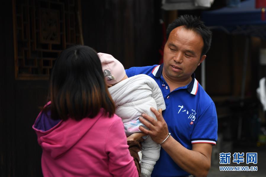 施六金(右)從妻子手中接過(guò)兒子施澤恩(4月25日攝)。1973年出生于十八洞村的施六金,由于父親患病很早就放棄學(xué)業(yè)和母親扛起了家庭的重?fù)?dān)。為了生活,他還曾遠(yuǎn)去東南亞打工。2015年,看到家鄉(xiāng)的變化,施六金回到村里開(kāi)起了農(nóng)家樂(lè),年度家庭人均純收入也從2014年的1715元增長(zhǎng)到了2019年的35696元。2018年,施六金與心愛(ài)的人組建了家庭。今年初,施六金與愛(ài)人迎來(lái)了一個(gè)大胖小子?!白鋈俗鍪乱没貓?bào)和感恩。”施六金給剛出生的兒子取名施澤恩。新華社記者薛宇舸攝
