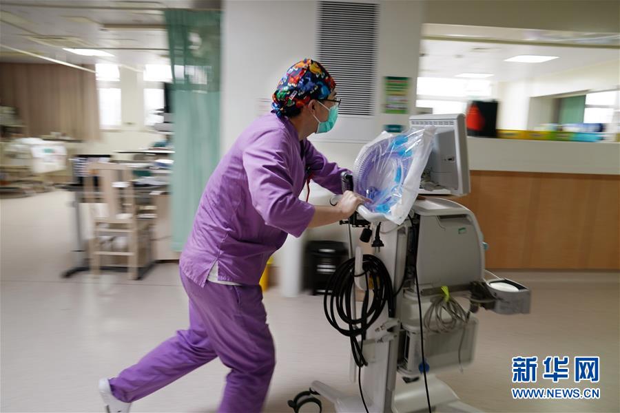 5月10日,在上海市普陀區(qū)中心醫(yī)院內(nèi)科重癥監(jiān)護室,護士來文健在推運設備。新華社記者劉穎攝