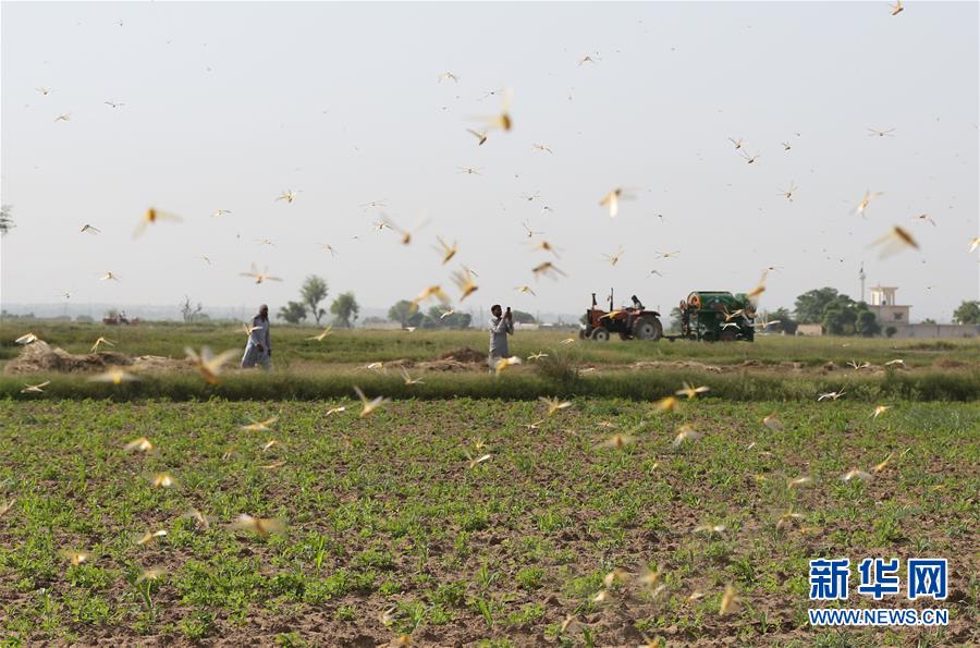 5月9日,在巴基斯坦旁遮普省杰格瓦爾地區(qū),當?shù)鼐用裨谔锏乩锱臄z蝗蟲。據(jù)巴基斯坦媒體報道,該國旁遮普省和信德省一些地區(qū)近期再次遭遇沙漠蝗蟲侵襲,當?shù)卣呀M織民眾進行緊急消殺。新華社記者 劉天 攝