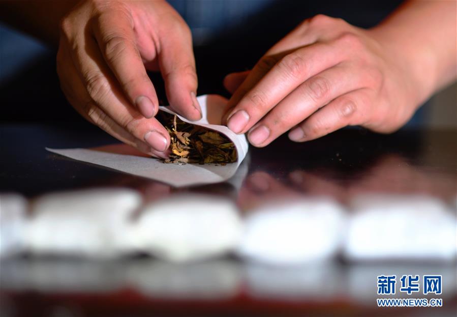 方舟在對(duì)新研發(fā)出的白雞冠茶用傳統(tǒng)綿紙進(jìn)行緊壓包裝(5月10日攝)。新華社記者魏培全攝