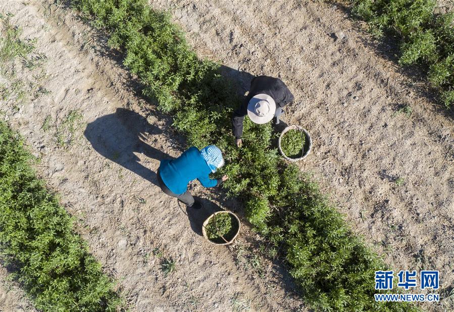 5月11日,采茶工在寧夏百瑞源賀蘭山基地采摘枸杞芽茶(無人機(jī)照片)。當(dāng)日,寧夏百瑞源賀蘭山基地枸杞芽茶全面進(jìn)入采摘季。據(jù)了解,該基地茶園面積300余畝,助力附近200多名農(nóng)民就業(yè)增收。新華社記者楊植森攝