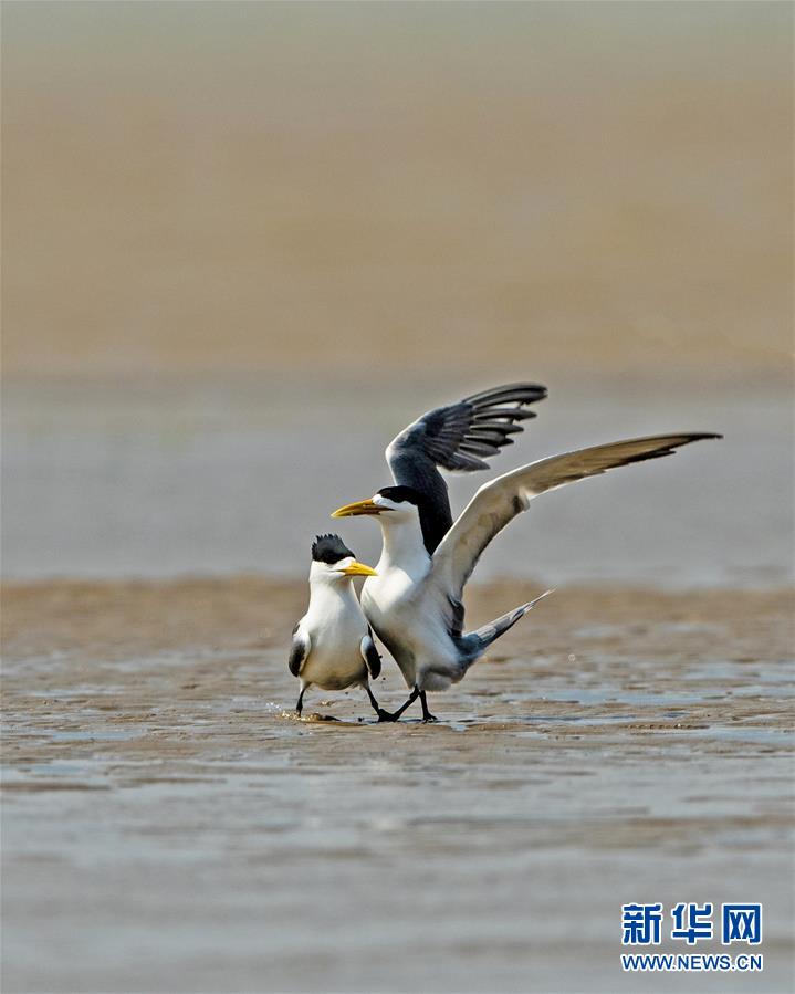 眼下正是大鳳頭燕鷗繁育的時(shí)節(jié),在福建閩江河口濕地核心區(qū)鱔魚灘的沙洲上,大鳳頭燕鷗正相互嬉戲(5月9日攝)。新華社記者梅永存攝