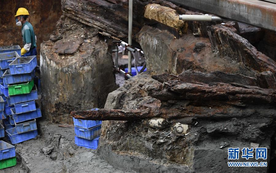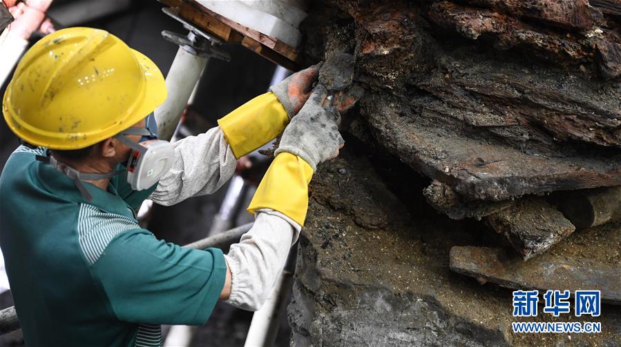 這是位于廣東陽江海陵島的“南海I號”已清理出的船艉部分(5月12日攝)。新華社記者鄧華攝
