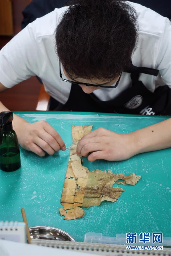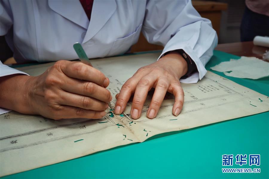 5月13日,天一閣藏品修復(fù)部主任王金玉在對書頁進(jìn)行修復(fù)。天一閣藏品修復(fù)部目前有修復(fù)師14人,每年約修復(fù)古籍14000余頁。據(jù)介紹,修復(fù)一冊古籍通常需要1至2個月,有的甚至需要1年以上。新華社記者鄭夢雨攝