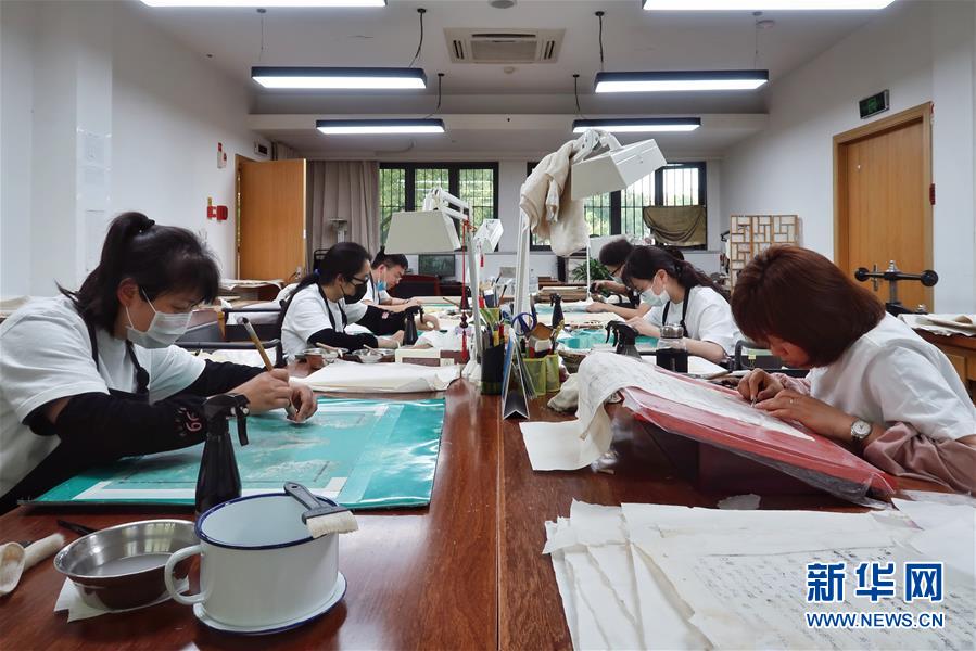 5月13日,古籍修復(fù)師在對書畫作品進(jìn)行裝裱操作。天一閣藏品修復(fù)部目前有修復(fù)師14人,每年約修復(fù)古籍14000余頁。據(jù)介紹,修復(fù)一冊古籍通常需要1至2個月,有的甚至需要1年以上。新華社記者鄭夢雨攝