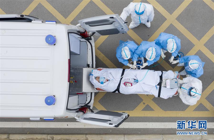 在華中科技大學(xué)附屬同濟(jì)醫(yī)院中法新城院區(qū),醫(yī)護(hù)人員護(hù)送一名剛做完CT檢查的新冠肺炎重癥患者上負(fù)壓救護(hù)車(3月6日攝,無(wú)人機(jī)照片)。新華社記者才揚(yáng)攝
