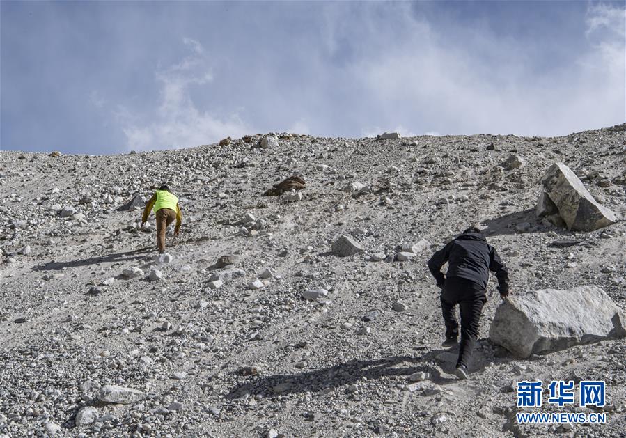 巡邏路上遇到車(chē)走不了的地方,拉巴次仁和同事就徒步攀爬,進(jìn)行巡邏(5月15日攝)。新華社記者孫非攝