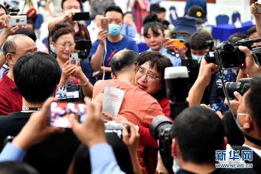 5月18日,李靜芝與失散32年的兒子毛寅擁抱。新華社記者張博文攝