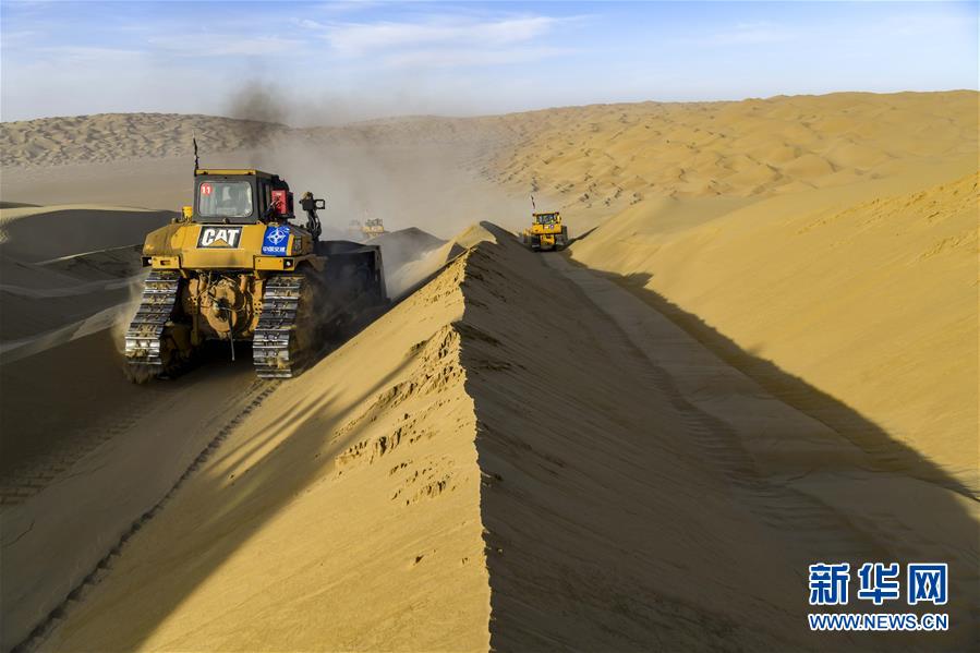 世界第二大流動(dòng)沙漠——塔克拉瑪干沙漠東部腹地,風(fēng)依舊在吹。極細(xì)的沙粒隨風(fēng)飄蕩,無(wú)孔不入。新疆尉犁至且末沙漠公路施工現(xiàn)場(chǎng)仍是機(jī)器轟鳴,多臺(tái)大型推土機(jī)一字排開(kāi),將高聳的沙山緩緩?fù)破健?/p>