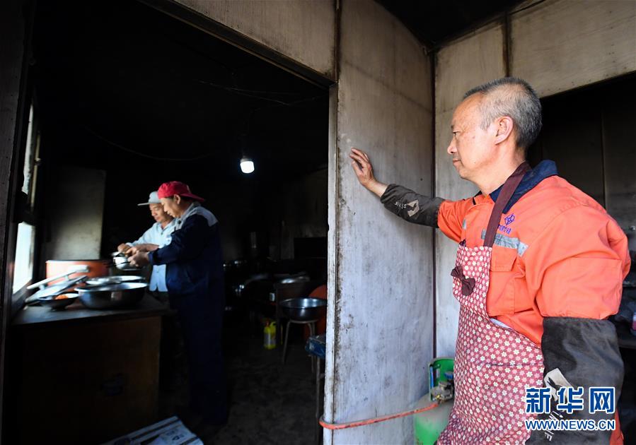 營(yíng)地廚師楊云明在一旁看工友們?nèi)〔停?月16日攝)。因?yàn)闋I(yíng)地僅有一個(gè)廚師,來(lái)自四川的楊云明自開(kāi)工以來(lái)一直工作生活在營(yíng)地里。新華社記者宋彥樺攝