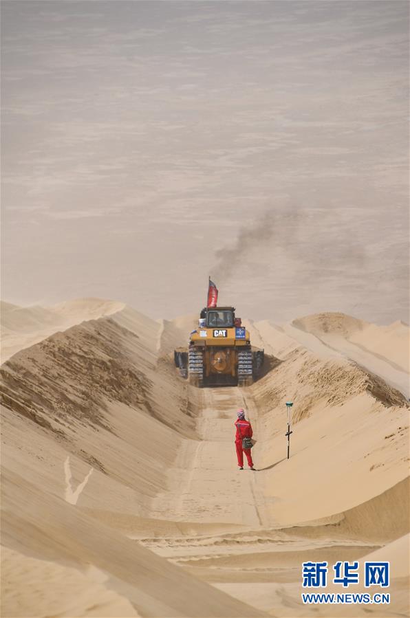 在新疆尉犁至且末沙漠公路施工現(xiàn)場(chǎng),測(cè)繪員劉耀軍在沙山旁測(cè)量并標(biāo)注施工線(5月17日攝)。新華社記者胡虎虎攝