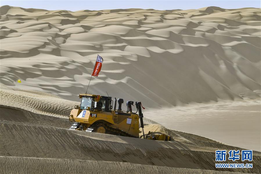 在新疆尉犁至且末沙漠公路施工現(xiàn)場,工人駕駛大型推土機推平沙山(5月16日攝)。新華社記者胡虎虎攝