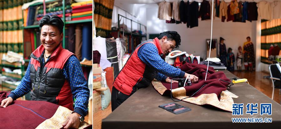 拼版照片:左圖為西藏昌都市江達縣字嘎鄉(xiāng)塔字村村民扎西江措;右圖為扎西江措在西藏昌都市江達縣格?;褡宸椉庸やN售公司制作藏裝。扎西江措學習藏裝縫制不到兩年時間,已經(jīng)是一名熟練的制衣工,現(xiàn)在月收入4000多元。在此之前,扎西江措靠放牧、四處打零工養(yǎng)活一家人(4月30日攝)。新華社記者詹彥攝