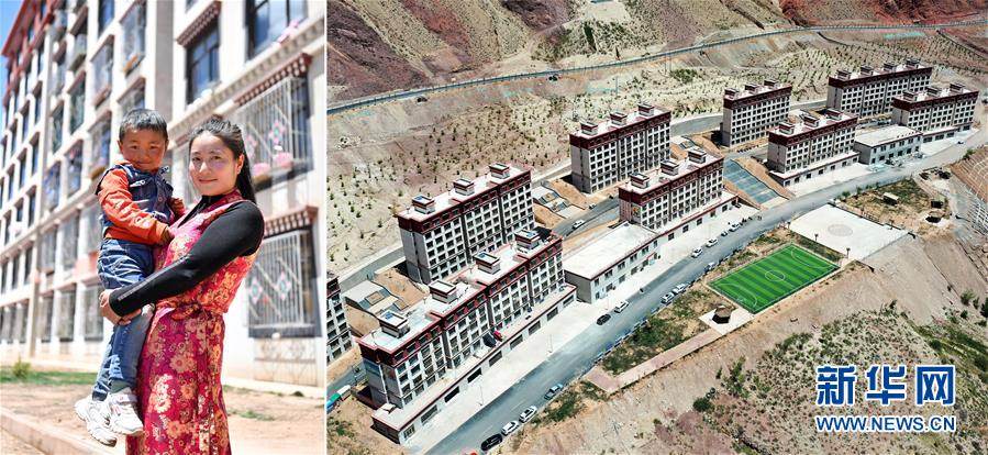拼版照片:左圖為西藏昌都市八宿縣夏里鄉(xiāng)吉熱村村民次日措姆和兒子加擁羅布在安置點樓前;右圖為八宿縣乃然易地扶貧搬遷安置點一角(無人機照片)。2018年,次日措姆和家人搬遷到乃然易地扶貧搬遷安置點,住進了75平方米的新居。次日措姆還在安置點找到一份保潔員工作,每月有1900元的收入 (5月10日攝)。新華社記者詹彥攝