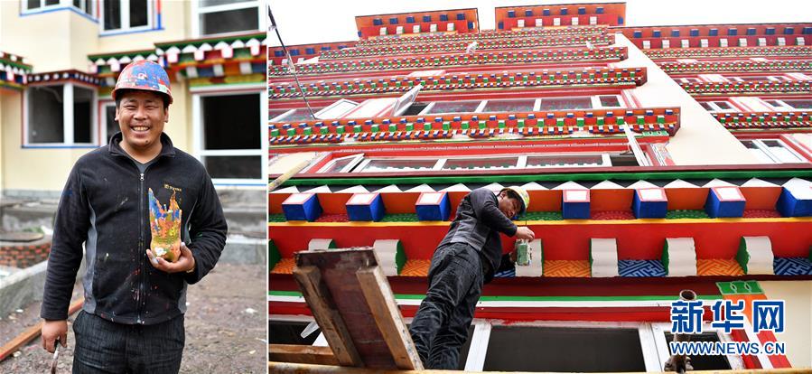 拼版照片:左圖為西藏昌都市卡若區(qū)卡若鎮(zhèn)卡若村村民洛松郎直;右圖為洛松郎直在昌都市一處建筑工地進行外墻彩繪作業(yè)。洛松郎直從小就喜歡畫畫,由于家境貧寒,初中畢業(yè)后,他回到家里干農(nóng)活、放牧,挑起家庭重擔,但一直沒有放棄畫畫的夢想。后來,洛松郎直前往卡若區(qū)拉多鄉(xiāng)學習唐卡繪畫,技藝得到很大提高。2017年,洛松郎直為卡若區(qū)一個周轉房建設項目繪制墻體彩繪。2018年,在村里的支持下,洛松郎直創(chuàng)辦了公司,承攬更多的藏式墻體彩繪工程(4月30日攝)。新華社記者詹彥攝