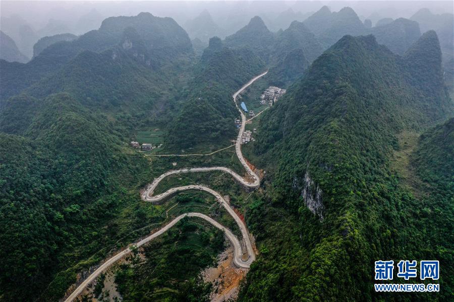 這是去年底通車的大化瑤族自治縣七百弄鄉(xiāng)江棟村那徐屯至弄獎(jiǎng)屯公路(5月14日攝,無人機(jī)照片)。新華社記者曹祎銘攝