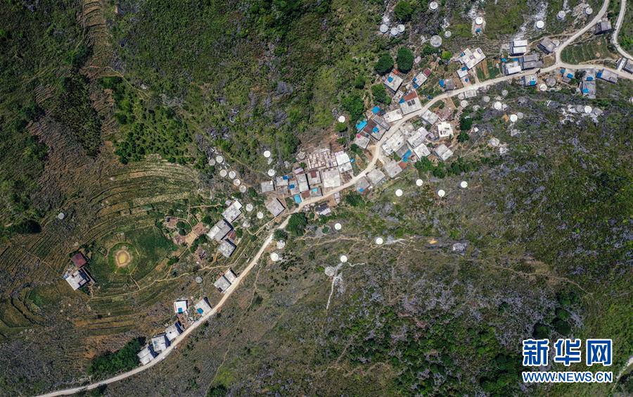 這是2019年底通車的大化瑤族自治縣七百弄鄉(xiāng)弄平村的進(jìn)村路和水柜(5月14日攝,無(wú)人機(jī)照片)。新華社記者曹祎銘攝