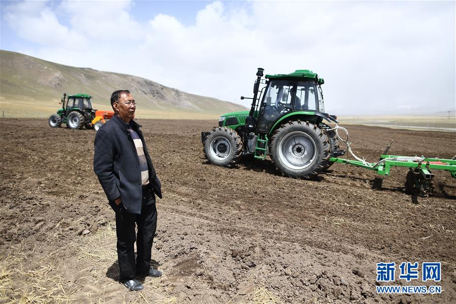 在青海省海北藏族自治州海晏縣青海湖鄉(xiāng)同寶村,者成倉(cāng)準(zhǔn)備播種(5月13日攝)。新華社記者張宏祥攝
