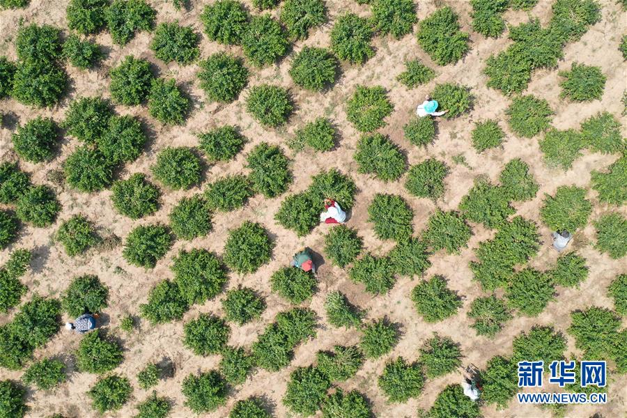 5月21日,河北省清河縣農(nóng)墾金銀花種植專業(yè)合作社社員在采收金銀花(無(wú)人機(jī)照片)。2017年以來(lái),河北省清河縣在推進(jìn)農(nóng)業(yè)產(chǎn)業(yè)結(jié)構(gòu)調(diào)整過(guò)程中,結(jié)合市場(chǎng)需求,立足當(dāng)?shù)赝寥馈夂蛱攸c(diǎn),依托公司“訂單”引導(dǎo)農(nóng)民發(fā)展金銀花種植。目前,清河縣金銀花種植面積近2000畝,帶動(dòng)40多個(gè)村莊的2000余名農(nóng)民人均增收千元以上。新華社記者牟宇攝