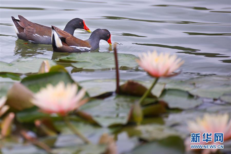 5月22日,兩只紅嘴水雞在蓮葉間游弋。近日,貴陽市觀山湖公園內(nèi)大片盛開的蓮花吸引了不少水鳥在其間嬉戲覓食。新華社記者劉續(xù)攝