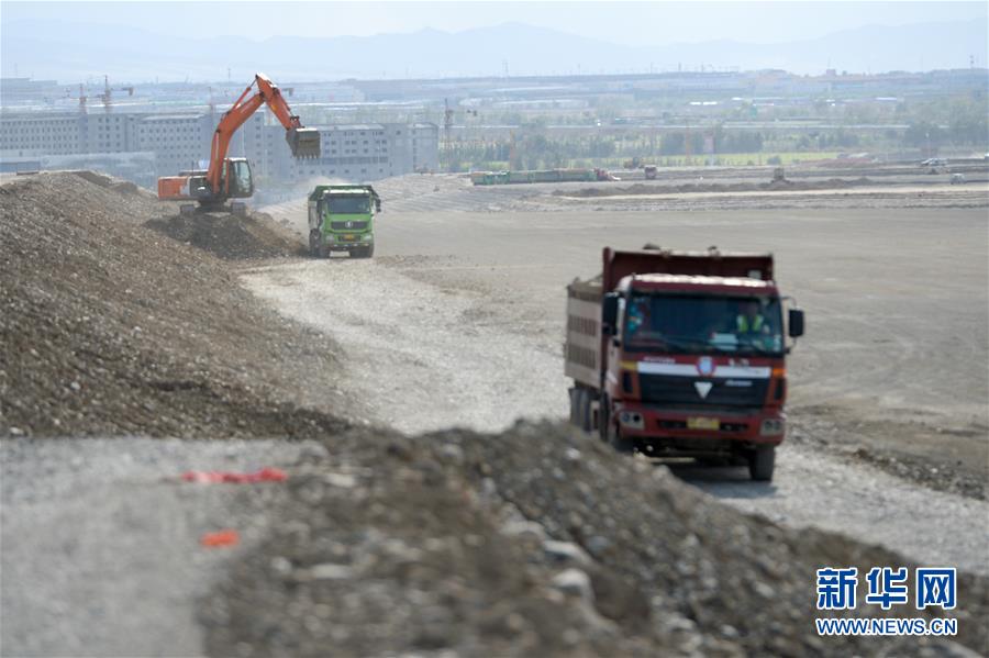5月23日,在烏魯木齊機(jī)場(chǎng)改擴(kuò)建工程施工現(xiàn)場(chǎng),施工車輛在飛行區(qū)進(jìn)行土方回填作業(yè)。新華社記者丁磊攝