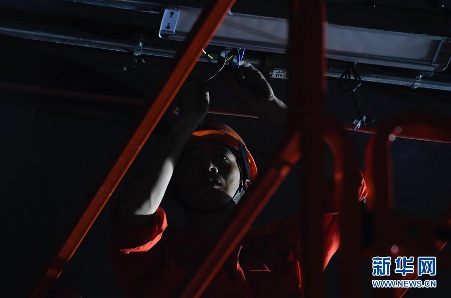 5月23日,工人在??谖拿鳀|越江通道項目隧道內(nèi)安裝照明設(shè)備。新華社記者楊冠宇攝